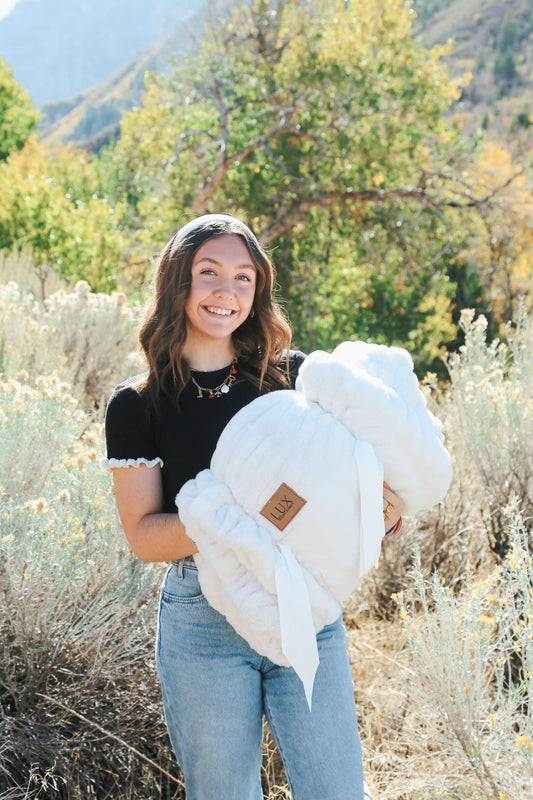 Shop now"I am absolutely in love with my Pearl White Lux Designer Blanket! The fabric is incredibly soft and plush, making it perfect for cozying up during chilly evenings. Not only does it look beautiful draped over my couch, but it’s also big enough to keep me warm and comfortable. The quality is outstanding; I can tell this blanket will last a long time. I love it!" - Kaitlyn
